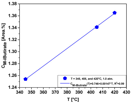 The concentration of methyl iso-butyrate increases linearly with increasing process temperature, being according to the results reported by Kaminsky and Frank [7], who reported that concentrations of methyl iso-butyrate, methyl acrylate, and methyl propionate increase with increasing temperature. The sum of concentrations of methyl iso-butyrate, methyl acrylate, and methyl propionate were 0.40, 0.48, and 1.59% (wt.), respectively, at 450, 490, and 590 °C, showing that higher temperatures favor the formation of side reaction products.