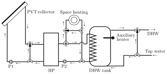 The heat pump extracts energy that is collected by the PVT collectors and supplies it, at a proper temperature level, to the fluid (water) in the load-side loop. In doing so, the heat pump consumes a small amount of electricity, about a quarter compared with the thermal energy output. The heated fluid is either supplied to the space heating system of the building or used to charge the DHW tank. In case there is a demand for DHW, water is extracted from the top of the tank. Tap water enters at bottom of the tank to replenish the tapped DHW. The draw-off loop includes a bypass valve. The bypass valve opens if the temperature of the fluid that leaves the tank is higher than the required DHW temperature.