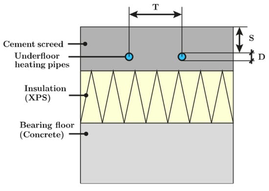 Figure 3 is a schematic of the construction of the floor heating system which is installed on both the ground and first floor. The top floor layer is a 0.11 m thick cement screed layer with pipes at a depth of s = 0.07 m. The pipes have an outer diameter of D = 0.015 m, a wall thickness of 0.002 m and a wall conductivity of 0.35 W m−1 K−1. The pipe spacing is T = 0.12 m.