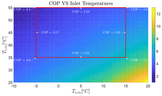 Fluid inlet temperatures versus the COP of the Vitocal 300-G heat pump, manufactured by Viessmann. The red rectangle indicates the temperatures limits between which data is specified by the manufacturer [20].