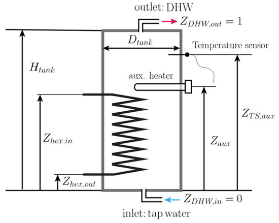 Figure 5 is a schematic representation of the DHW tank. In addition, Table 11 lists the geometrical features. The DHW tank is connected to the heat pump via a helical tube heat exchanger. A backup heater is installed to ensure a sufficiently high temperature in the upper region of the tank and serves as a backup in case the heat pump cannot meet the DHW demand. The regulation of the backup heater is carried out by a temperature controller, which is installed at a relative height of 0.90. If the backup heater is previously turned off, the heater stays off until the temperature at the controller drops below 50 °C. Conversely, if the heater is previously turned on, it stays on until the temperature at the controller reaches 55 °C. The heat loss capacity rate from the storage to the environment is assumed to be 1 W K−1. Under the assumption that the environmental temperature, e.g., the air temperature in the attic, is 15 °C and the average fluid temperature is 55 °C, the corresponding annual heat loss is in the order of 350 kWh. Lastly, it is noted that the tank losses are assumed to be a factor 1.3 higher for the DHW tank with a volume of 250 L (four-person household).