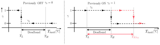 Mode 1 is the standby mode in which the system is turned off and does not supply thermal energy. In case the sensor in the DHW tank signals that the temperature in the DHW tank drops below °C, a signal is sent to the controller. If possible, i.e., the operating limits of the HP are not violated, the system is operated in Mode 2 and the tank is charged. As shown in Figure 6, the charging stops when the upper temperature limit °C is reached. Once a week, the upper temperature limit is increased to °C to eliminate, and prevent the growth, of the legionella bacteria in the DHW tank.