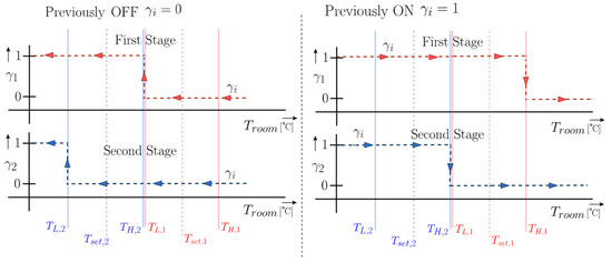 In Mode 3 up to Mode 5 thermal energy is supplied to the floor heating system of one or both floors. A two-stage room thermostat monitors the temperature on the ground and first floor. Figure 7 is a control schematic of the two-stage room thermostats. The first stage of the thermostat turns on when the air temperature drops below the lower threshold. In general, the charging of the DHW tank (Mode 2) has priority over the supply of space heating (Mode 3 up to and Mode 5). Hence, in case the system runs in Mode 2, and the DHW tank is charged, and the first stage of one or both of the room thermostats is activated, the system will remain to be operated in Mode 2. However, if the air temperature in the building continues to drop and the lack of space heating threatens to lead to uncomfortable conditions, the second stage of the room thermostat is activated. If the latter is true and the second stage of a room thermostat is activated, the space heating (Mode 3 up to and Mode 5) has priority on the charging of the DHW tank (Mode 2). Finally, in case there is a space heating demand, the second stage of one or both thermostats is activated and the operating conditions at the HP pump are outside the operating limits, the internal backup heater of the HP turns on and supplies space heating to the building (Mode 6 up to and Mode 8).