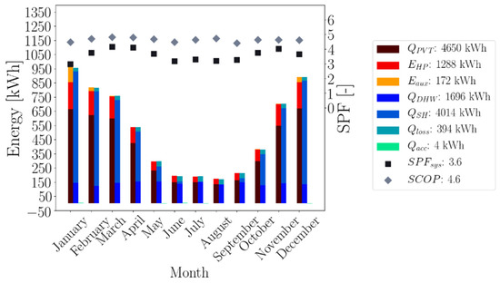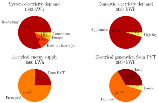 Figure 19 shows the monthly thermal and electrical yield from the PVT collectors. The annual electrical yield is 2.7 MWh, which corresponds with a specific yield of 180 kWh m−2. The monthly electrical yield reaches a maximum in the summer, which is the season with the highest irradiation level. In contrast, the opposite is true for the thermal yield. The thermal yield namely follows the demand which, due to the space heating demand, reaches a maximum in the winter. On an annual basis, the resulting thermal yield from the PVT collectors is 4.7 MWh, which corresponds with a specific yield of 310 kWh m−2.