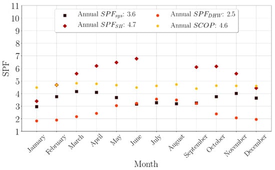 From the system’s perspective, 15.1% of the system’s electricity demand is generated on-site and 11.1% of the electricity generated by PVT collectors is supplied directly to the system components such as the heat pump. The development of the differs from the general OEF, which also includes the domestic electricity demand. The latter namely increases towards the summer, whereas the decreases which imply that relatively less energy is generated on-site in the summer. From this observation, it can be concluded that the system is not exploiting the sunlight to its full potential in the summer. In order to increase the self-efficacy of the system it is recommended to further investigate the correlation between the activation of the system, for DHW charging, and the—forecasted—irradiation level.