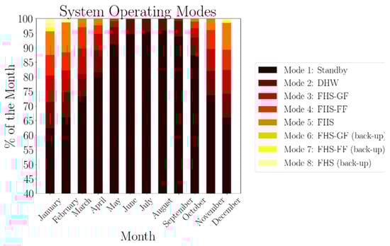 The control strategy is a decisive factor for the system’s performance. In this study, a straightforward control strategy is adopted. The air temperature in the ground and first floor, which are equipped with a floor heating system, are monitored to determine whether there is a space heating demand. The fluid temperature in the DHW tank is monitored for two reasons: to determine whether or not the tank must be charged and to fulfill the legionella prevention function. On top of that, the operating limits of the heat pumps are protected and, if necessary, the backup heaters are activated to be able to cover the demand when the heat pump is not able to do so. A distinction is made between eight different operating modes which are listed in Table 12.