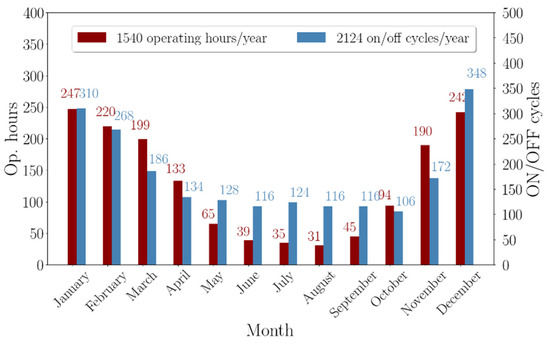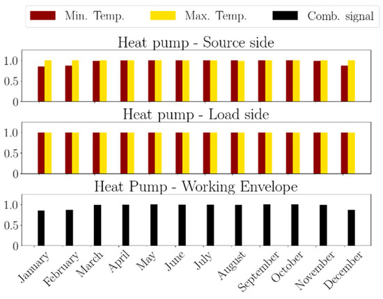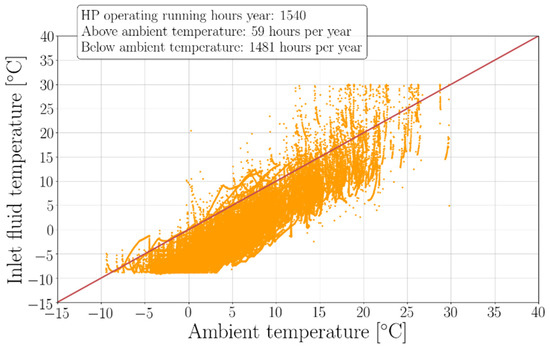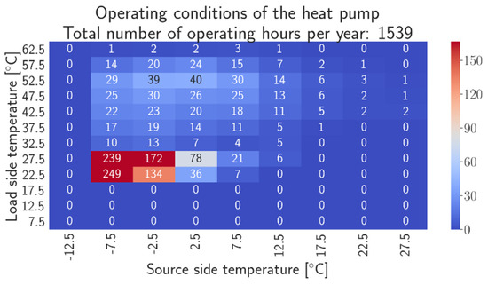 Figure 15 is a heat map of the operating temperatures of the heat pump. Out of the total number of operating hours, the heat pump is operated approximately 60% of the time at source side temperatures between −10 and 10 °C and at load side temperatures between 20 and 30 °C. The fact that the system is operating a handful of hours at load side temperatures higher than 60 °C indicates that the system is fulfilling the legionella prevention function.