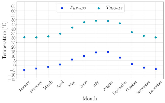 Monthly weighted inlet fluid temperatures at the source and load side of the heat pump.