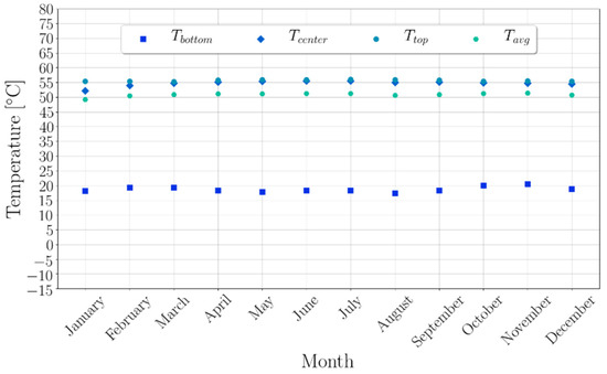 Monthly mean fluid temperature at distinct locations inside the domestic hot water storage tank.