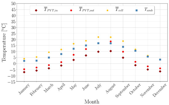 Monthly operating and weighted operating temperatures related to the performance of the PVT collectors. The cell temperature of the PV panel, is included for reference purposes.