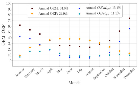 Monthly and annual On-site Energy Fraction (OEF) and On-site Energy Matching (OEM). A distinction is made between the OEF and OEM including and excluding (system) the domestic electricity demand.