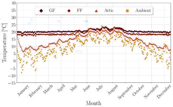 Figure 23 shows the daily average air temperature in the different building zones. In addition, it contains the daily average ambient air temperature. The air temperature at the ground and first floor fluctuate around the setpoint temperature. There are two periods, at the end of January and at the end of December when there is a slight drop in the air temperature at both zones. The figure shows that these periods coincide with a drop in the ambient air temperature, with temperatures going down to −10 and −5 °C in January and December, respectively. During these periods the capacity of the PVT collectors as an energy source is insufficient and the internal backup heater of the heat pump is activated to ensure comfortable conditions in the building. Finally, it is noted that the daily average floor surface temperature at the ground and first floor, which are both equipped with a floor heating system, meet the comfort requirements, and does not exceed 29 °C.