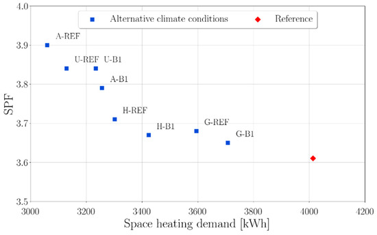 Seasonal Performance Factor (SPF) versus the space heating demand for different climate conditions. With exception of the climate conditions, the cases are identical to the reference case.