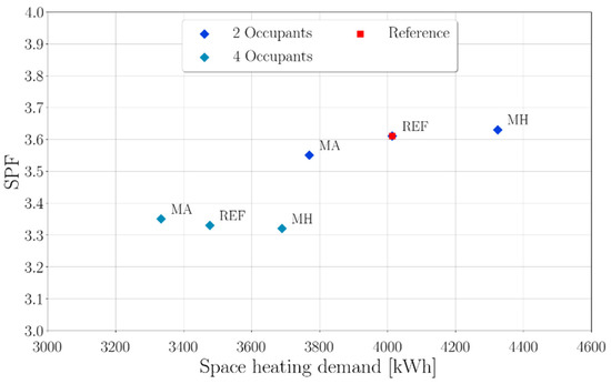 SPF versus the space heating demand for different number of occupants, two or four, and three different occupancy profiles: Reference (REF), Mostly at Home (MH), and Mostly Away (MA). Note that the corresponding DHW demand for a respective two and four-person household are 6 and 12 GJ.