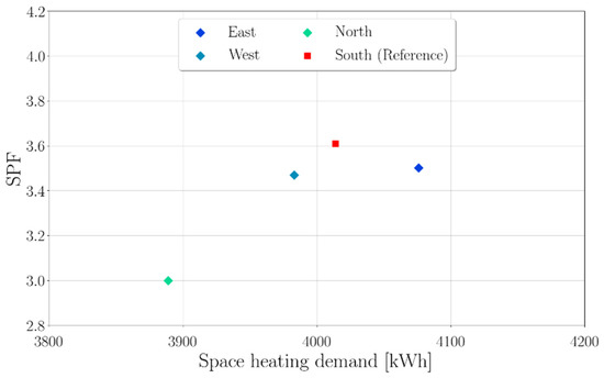 SPF versus the space heating demand for different building orientations. The orientations are shown in the figure refer to the direction that the back side of the building, and thus the PVT collectors, are facing.
