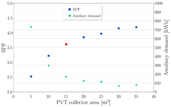 SPF and the auxiliary energy demand for different collector areas (Dimark Solar). The SPF is indicated by the blue dots, the auxiliary energy demand by the green squares.