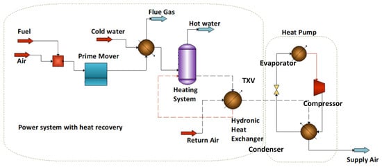 The primary modeling approach involved thermodynamic modeling of the combined energy system, including the power generation module, using the process simulation software package ChemCAD (Version 7.1) to calculate the useful thermal and electrical output. The Peng–Robinson equation of state was used for the global K-value and enthalpy models were used in the process simulation models. CHEMCAD is a powerful and flexible chemical process simulation environment. It combines a state-of-the-art graphical user interface (GUI), an extensive chemical component database, a large library of thermodynamic data, and a library of the most common unit operations. This software package is capable of modeling continuous, batch, and semi-batch processes, and it can simulate both steady-state and dynamic systems while providing an extensive array of the most up-to-date thermodynamic methods for performing heat and material balances. The primary energy sources considered involved natural gas and/or hydrogen. The effects of different configurational aspects with solid oxide fuel cells (SOFCs), thermionic emitters (TIEs), and heat pumps were studied in buildings consuming various degrees of thermal energy for hot water or space heating or both. The model accounted for complete conversion of the fuel while exchanging the thermal energy generated (after electric power generation) in a primary heat exchanger, serving the thermal loads. Figure 1 displays the thermodynamic model used in this study. The dotted lines in Figure 1 represent integration of the cogeneration configuration with a heat pump system in a commercial building. Primary components in these configurations included the following: