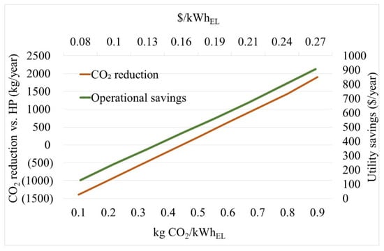 As shown in Figure 2, the annual CO2 reduction capacity of the 0.2 kW cogeneration system reaches 2000 kg at a grid carbon dioxide intensity of 0.9 kg/kW; however, no savings are achieved at a grid carbon dioxide intensity of 0.44 kg/kWh. The presence of such a cogeneration system does not offer environmental benefits at grid carbon intensities below 0.4 kg/kWh, although the annual utility bill savings reach nearly $900 at electricity costs of $0.27/kWh. Since the thermal energy is one of the significant loads in a building, it is important to consider the carbon intensity of the electrical grid in the case of utilizing highly efficient electrical heat pumps. As shown in Figure 2, as the electrical grid’s carbon intensity increases beyond 0.45 kg/kWh, the 0.2 kW cogeneration system proves to be the energy efficient approach rather than a heat pump. However, for buildings in locations served by cleaner electrical grids with carbon intensities below 0.45 kg/kWh the heat pump based thermal providers are the most effective in lowering the carbon footprint.