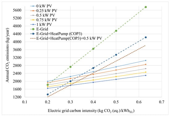When considering different energy-efficient technological solutions for building applications, the transformation of energy supply and demand must be considered. Some of the factors that will be affected by this transition include: (1) increased electrical loads owing to the adoption of new energy consumers within a building (e.g., electric vehicles, electrical heating); (2) adoption of low-carbon fuels (e.g., renewable hydrogen); (3) seasonal, geographical, and time-of-day variance in an electric grid’s carbon dioxide intensity; and (4) regional infrastructure limitations. In light of these aspects, the analysis presented in the previous subsections was updated by considering a higher daily energy demand of 30 kWh of electrical energy and 60 kWh of thermal energy in a building. The primary energy providers considered were electrical, gas, and cogeneration systems. A heat pump was considered with a COP of 3, gas-based heating with both natural gas and 30% renewable hydrogen blended with natural gas, and a cogeneration system with electrical efficiency of 30%. The methodology used in the previous subsections was adopted in this analysis as well and the electric grid’s carbon dioxide intensity was varied from 200 to 800 gCO2/kWhEL, as shown in Figure 4. In comparison with electrical heat pumps, natural gas-fired heating equipment does not offer any environmental benefits until the grid carbon dioxide intensity exceeds 0.55 kg/kWh. The use of low-carbon fuels was also investigated by considering 30% renewable hydrogen blended with natural gas. The blended compositions offered lower the annual carbon footprint at grid carbon intensities above 0.4 kg/kWh. The use of a 30% electrical efficient prime mover capable of operating on such a blended fuel further lowered the annual carbon footprint at all grid carbon intensities except 0.2 kg/kWh.