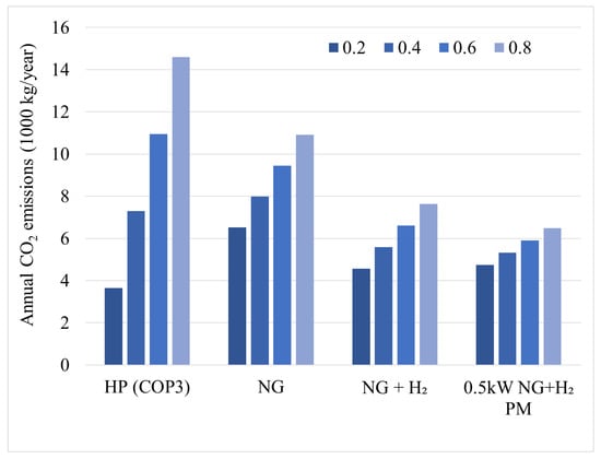 Annual CO2 emissions in a residential building consuming 30 kWh of electrical energy and 60 kWh of thermal energy per day, serviced by different technological solutions and primary energy resources. HP—heat pump; NG—natural gas; H2—Hydrogen; PM—prime mover.