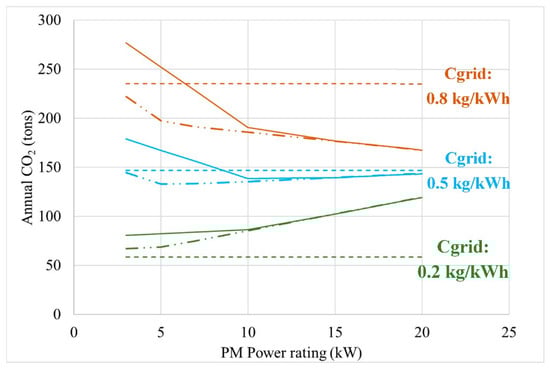 The carbon dioxide emissions reduction was calculated based on the carbon factor (kilogram of CO2 emitted per unit of fuel or kilowatt-hour of grid electricity) for the electrical grid supply and the local fuel consumption associated with the power device and the thermal load. For each configuration investigated, the thermodynamic model provided the total fuel consumption (m3) and amount of electricity produced onsite (kWh). The net annual emissions reduction (CO2,savings, kg/year) was calculated according to Equation (1) by considering the carbon factor (CO2,grid, kg/kWh) of the electrical grid, annual utility grid purchase offset (kWhgrid sales) owing to on-site generation between cogeneration and PV (if utilized), carbon dioxide intensity of the fuel (CO2,fuel = 10.55 kWh/m3 for natural gas), and the difference in annual energy consumption between the baseline configuration and the cogeneration equipment (m3fuel savings).