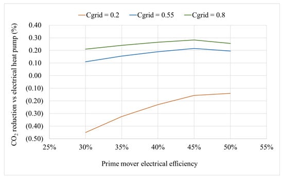 Influence of 10 kW prime mover’s electrical efficiency on the CO2 reduction potential in a commercial building consuming 1000 kWh of energy per day vs. heat pump system with a COP of 3 via a hybrid cogeneration system at different electric grid carbon intensities. Cgrid—Electric grid carbon dioxide intensity (kg/kWh). Negative values are represented in ( ).