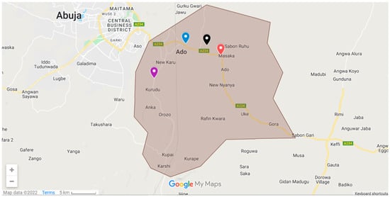 The Greater Karu Urban Area is situated between latitude 8.996456 and longitude 7.632282. It is a conurbation of hybrid formal and informal settlements, and it is approximately 28 km from Abuja, the capital city of Nigeria [47]. This makes it a strategic location for informal workers to live and travel to and from, in order to escape the expensive cost of living in Abuja. The population growth rate peaked at 40% per annum, giving it one of the fastest urbanization rates in the world [47,52]. Some of the settlements include Ado, New Karu, Masaka, Mararaba, Orozo, Karshi, Kurudu, and Uke. The informal workers resort to erecting illegal structures in the Greater Karu Urban Area to shelter their families. The face me-I-face you (tenement building) represents the prototype of the informal housing structures that are prevalent in GKUA. The average number of hours of electricity supply in the Greater Karu Urban Area (GKUA) is 5 h per day [53].
