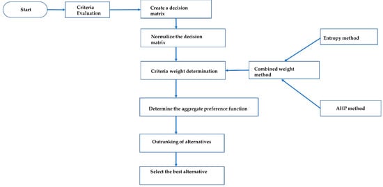 To overcome the shortcoming of the above methods and improve the accuracy of criteria weight determination, the integration of subjective and objective weights into one single component was achieved using the integrated method proposed in the work of Ma et al. [85]. The integrated weight method is also supported in these studies [86,87,88]. However, Jahan et al. [89] proposed the combination weighting method after criticizing the accuracy of the integrated weight formula and noting the inconsistencies observed with the inclusion of objective weight values. The application of the combined weight formula can be found in these studies [90,91,92]. The combined weight method was tested on other MCDMs in the work of Vinogradov et al. [92].Therefore, this study applied the combination weighting method to obtain an accurate measurement of the objective and subjective criteria.