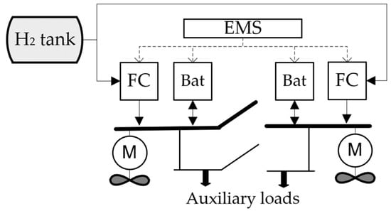 The next component of the hydrogen fuel system is the fuel cell/battery hybrid ship system. The chemical energy stored in hydrogen is converted into electricity and used onboard for several purposes such as propulsion (after conversion to mechanical energy), electronic equipment and lighting, among others. In the on-road mobility market, fuel cells of the PEM type became the most dominant because of their quick start-up times, simple structure and improved transient performance for mobile applications. PEM fuel cells, running on green hydrogen, are among the cleanest combustion systems, as they minimize GHG emissions and the emittance of hazardous substances into their direct environment [37]. To achieve sufficient transient performance and full maneuverability of the ship, it is beneficial to combine the fuel cell with a battery in a hybrid system [38]. Most favorable are batteries using lithium-ion chemistry, which provides the most advantageous combination of energy density, possible charging and de-charging rates, and energy efficiency [39]. The efficient interaction of fuel cell and battery in the different operating states of the ship is controlled by an energy management system (EMS). EMS can be realized in various forms, such as rule-based and optimizing strategies [40]. The specific control strategy determines the final share of the energy supply contributed by each component in the energy system. A simplified depiction of a ship fuel cell hybrid system (without voltage and current conditioning) is shown in Figure 2 [41]. A battery (Bat) and PEM fuel cell (FC) feed into a common electricity bus, controlled by the EMS. The PEM fuel cell is fed from a hydrogen tank, the battery is charged and discharged from the shared electricity bus. From the main bus, energy is supplied to the electric motor and propeller for the propulsion as well as to the secondary bus to supply auxiliary loads.