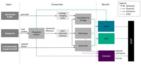 The operational profile, energy use and local renewable energy potential were utilized for the sizing of fuel system components, ship propulsion system, fuel station, storage, electrolysis and wind farm, as shown in Figure 3. The CAPital EXpenditures (CAPEX) were derived from the sizes of the components and the OPerational EXpenditures (OPEX) and emissions from the demand-driven operation of the fuel system. Finally, the Levelized Costs Of Transportation (LCOT) could be calculated. In the following, the different conversion steps for component sizing are described.
