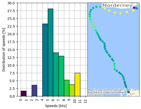 First, the operation of the two vessels was analyzed, identifying their routes of operation, vessel speed, service patterns and typical times of port calls by tracking the AIS signals. Figure 4 shows one crossing of the Frisia III between its main port of Norddeich and the island of Norderney. The speed profile over its course can be identified by the colors ranging from dark blue (at berth) to yellow (cruising speed).