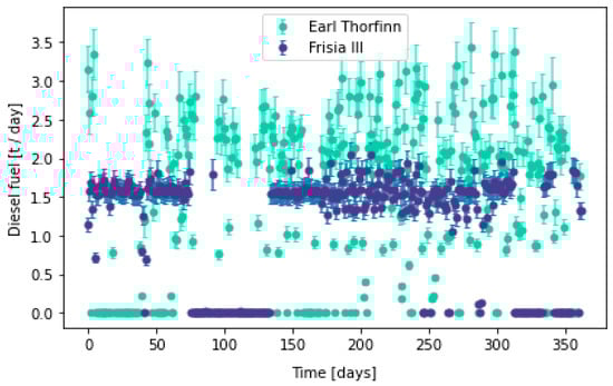 One can note that the installed capacity of the Earl Thorfinn exceeded that of the Frisia III, despite being a much smaller vessel, which can be ascribed to the harsher operating conditions on the Orkney Islands. Further parameters specific to the case study, as well as conversion factors utilized in the sizing and costs calculations, can be found in the full parameter set in Appendix A, Table A3.