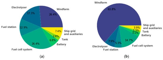 Hydrogen fuel system energy use and wind energy generation under the parameter set of Appendix A, Table A3, for the (a) Earl Thorfinn and (b) Frisia III.