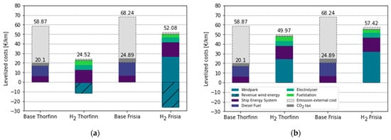 For both systems, the base system and the alternative hydrogen system, levelized costs of transportation were calculated. The investment cost (CAPEX) and annual operating cost (OPEX) values of all system components were determined by cost factors, e.g., the nominal power of a component or the consumed fuel mass. The cost factors were determined based on literature research and industry interviews, as documented in Appendix A. Additionally, for the hydrogen-based system, excess energy from the wind farm was fed into the electricity grid, generating revenues . The prices per kWh were determined by the average spot market and a supplemental renewable energy premium if applicable. If a premium was part of the wind energy bidding process, e.g., as in Germany [50], an exponential decay () of the premium was assumed, with a major drop in the next five years due to increasing competition.