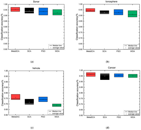Seven data sets, namely Sonar, Ionosphere, Vehicle, Cancer, Wine, WBDC and Diabetes, were selected to compare the stability of the feature selection models of the MetaSCA, the SCA, the WOA, and PSO. Figure 8a–g exhibit the stability comparison results of the four algorithms for feature selection on the Sonar, Ionosphere, Vehicle, Cancer, Wine, WBDC and Diabetes datasets, respectively. The red, black, blue and green boxes represent the results obtained from MetaSCA, SCA, PSO and WOA respectively. The horizontal line above the box body in each comparison figure at the top represents the maximum classification accuracy obtained after the method was run on the data set 10 times. Accordingly, the horizontal line at the bottom of the box corresponds to the minimum classification accuracy, and the horizontal line in the box represents the median of 10 results. In addition, the larger the volume of the box, the greater the degree of discretization, and the more unstable the result of this optimal method. First, as shown in Figure 8a–g, after 10 repetitions of classification, the highest classification accuracy obtained by the MetaSCA was superior than the other three optimization algorithms, except for the highest classification accuracy of the four feature selection methods on the wine dataset (Figure 8e); all algorithms achieved a 100% accuracy. Furthermore, combining the results of the seven comparison graphs in Figure 8a through Figure 8g, the worst classification accuracy obtained by the MetaSCA model was also higher than those of the SCA, PSO, and the WOA, in the comparison of the worst classification accuracy on different data sets. Finally, the discreteness of the classification accuracy of the four optimizations on different datasets is compared. Among the three data sets of Sonar (Figure 8a), Ionosphere (Figure 8b), and Wine (Figure 8e), the MetaSCA model had the least degree of dispersion. Moreover, the discreteness of the classification accuracy with the MetaSCA feature selection model was better than the results of the SCA model with all data sets.