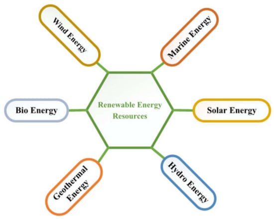 Modern power systems are going through a rapid transformation because of the integration of various renewable energy sources and the introduction of new systems such as autonomous grids, micro-grids, nano-grids and smart grid technologies [5]. Interconnecting the renewable energy sources, such as wind turbines, tidal turbines, geothermal plants, biomass plants, hydro power plants and photovoltaic cells, etc., makes the production of active power uncertain, as shown in Figure 1 [6]. A huge amount of research has been performed on the utilization of solar energy resources. Traditionally, the hydro energy systems are considered the best environmentally friendly source of energy, but its initial cost and time of construction is large, so solar energy is considered an easy alternative because of its lower construction cost and portability [7]. Hence, frequency deviations cause unreliable power system operation. These days, a power system is not vertically integrated but a deregulated entity requiring the unbundling into horizontal and vertical elements. In such circumstances, the analysis and development of improved frequency controller units becomes essential. A lot of research has been carried out for the development and improvements in the design of Load Frequency Controllers [8]. In [9], Krishan et al. worked on the automatic generation control of multi-area power plants with the help of a PID controller. In [10], robust multivariable predictive-based load frequency control was achieved considering the generation rate constraint. However, the designed controllers do not provide outstanding values of settling time, peak overshoot or peak undershoot values. The main task of a Load Frequency Controller is to adjust its parameters in accordance with its environment and reach a stable state quickly [11,12]. A lot of research has been carried out in an attempt to realize an ideal Load Frequency Controller, but most of the controllers have poor settling time issues, and recent research trends utilize the intelligent design technique in LFC design. In [13,14], an Artificial Neural Network-based LFC design targeted the deregulated electricity market. It is an example of an intelligent controller with a learning mechanism based upon surrounding events and incidents. The steady state response must be reached quickly with lower settling times and lower transient values [15,16].