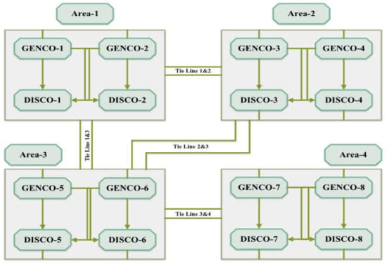 Figure 5 shows the Tie Line Interconnection of various GENCOs; here, the system is divided into various areas. Each area contains generation companies (GENCOs) and distribution companies (DISCOs), while the tie lines are used for interconnection purposes. Making such a configuration in terms of the number of areas improves the manageability of the power system. In each area, the power flows between the GENCO and DISCO, while tie lines allow the power flow in-between the areas. There is a bidirectional power flow in-between the areas, GENCOs and DISCOs.