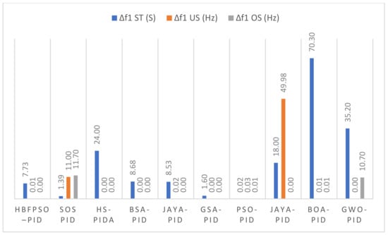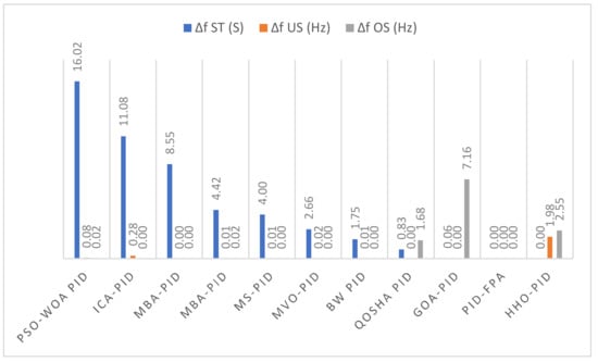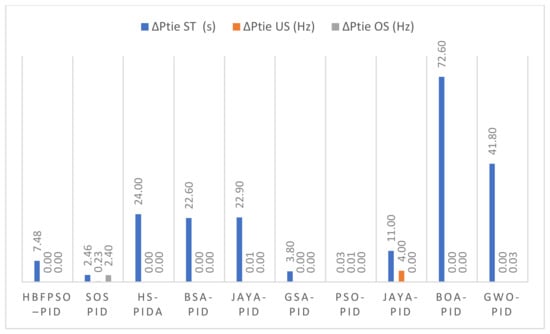 In [77], a novel modified robust load frequency control was developed for massless inertia photovoltaics penetrations via the hybrid PSO-WOA approach. In [78], ICA-PID was developed for the primary frequency regulation of a micro-grid by de-loaded tidal turbines. In [79], the Mine Blast Algorithm tuning was performed in a PID controller for performance enhancement of the micro-grid system with SMES storage system. In [80], the Mine Blast Algorithm was used for the tuning of PID employed in parabolic through a solar–thermal–wind–diesel-isolated hybrid power system. In [81], a novel multistage PID approach was adopted for frequency dynamics control in an islanded micro-grid. In [82], frequency regulation was used in an AC micro-grid with and without an electric vehicle using a multiverse-optimized fractional order PID controller. The settling time and peak undershoot values are well-optimized serving as performance indices of system robustness against load disturbances and parameter variations. In [83], BW-PID was used for tidal supplementary CONTROL schemes-based load frequency regulation of a fully sustainable marine micro-grid. In [84], quasi-oppositional harmony search algorithm-based optimal dynamic load frequency control of a hybrid tidal–diesel power generation system was performed. In [85], an Optimal Power Flow Controller was developed for grid-connected micro-grids using the grasshopper optimization algorithm. To tackle the performance issues in an autonomous hybrid power system, the tuning of a PID controller was performed using the flower pollination algorithm (FPA) [86]. It is clear that an FPA-tuned PID controller provides better values for US and OS parameters. The designed controller performs better than the PI controller in terms of peak transient deviation and settling time. The optimum gains of the controller remain unchanged for various load conditions, making it a good choice under a dynamic loading operation. In [87], HHO-PID was developed for multi-area multi-source load frequency control of interrelated power system.
