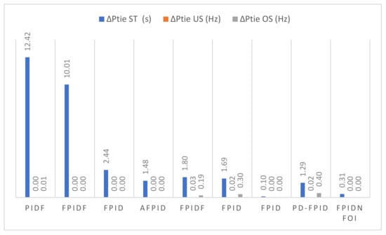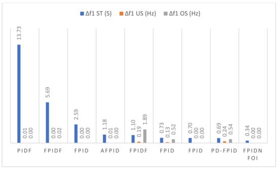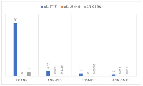 ANN-based controllers belong to a set of intelligent control devices based on a training set; it observes the events and updates the training set. A set of adaptive training rules is responsible for updating the knowledge of the controller. The ANN observers perform precise estimations of actual variables yielding convergence of estimation to zero. In [102], the authors presented a Fractional Order ANN Controller for LFC of an EVS-Integrated deregulated power system targeting a multi-area solar-thermal power plant and EVs. The proposed topology lowers uncertainties, complexities and non-linearity of the power system, yielding a better dynamic frequency response compared to FOPI, PI and other controllers. In [103], an Artificial Neural Network-tuned PID controller was designed for distributed generation including wind turbine generators, battery energy storage systems, aqua electrolyzers and diesel engine generators. A Sliding Mode Controller is based on a sliding surface with parameters necessary for frequency regulation. SMC is an advanced controller operating continuously providing a smooth dynamic frequency response with lower non-linearity. In [104], load frequency regulation was performed in an interconnected power system using a second order sliding mode control (SOSMC) combined with a state estimator. The designed controller provides a reduced settling time and lower overshoots. The proposed topology has a robust performance under matched and mismatched uncertainties. The real-time implementation of the control system is possible with accurate parameter adjustments. In [105], frequency regulation was performed using a neural network observer-based controller in the power system. A three-layer feed forward neural network was developed for ANN observer, while the training of data set is performed using the modified adaptive training rule. The results are improved system dynamics with reduced frequency oscillations. It can be seen here in Table 5 that [105] ANN-SMC gives the lowest settling time at 2 s. The [102] FOANN has the worst settling time value at 60 s. The undershoot value is lowest for [13] ANN-PID. The ANN and SMC controllers have complicated structures, and the operation is difficult compared to a simple PID-based controller. It is clear in Figure 13 that ANN-SMC is the best controller in terms of settling time, overshoot and undershoot.