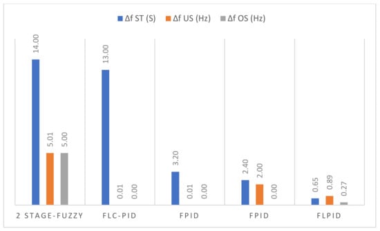 The graph in Figure 12 shows that FLPID in [102] is the best FLC controller for isolated systems. The fuzzy logic controllers have implementation issues, and the real-time response deviates significantly from the simulated one. The introduction of transients and addition of delays worsens the performance of fuzzy logic controllers.