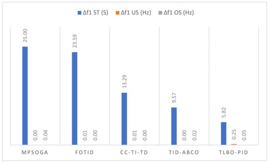 From Figure 14, it is clear that TLBO-PID gives the lowest settling time value. Figure 15 shows that [84] CC-TI-TD has the worst settling time value. The variation of different techniques yielding different parameters is shown in both Figure 14 and Figure 15. TID controllers show improved values for overshoot and undershoot, but settling time is not good.