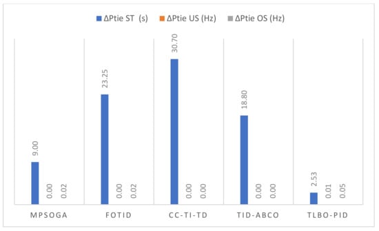 Table 6 discusses the performance indices of the TID controller in an interconnected power system. The settling time decreases from [106] MPSOGA to [110] TLBO-PID. The latter one has the lowest settling time value at 5.82 s.