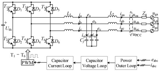 Furthermore, a VSG is a converter that is composed of power electronics components; it has the characteristics of power electronics converters. Therefore, a VSG will have the same problem as the conventional grid-connected inverter, which is the harmonic interaction with the utility grid. A distorted utility grid or weak utility grid will affect the system stability and quality of the grid current [,]. In addition, it cannot effectively deal with the influence of the polluted grid by adjusting the parameters of the power outer-loop controller, such as the rotational inertia or droop coefficient, since the response time of the outer loop is much lower than the harmonics frequency. Therefore, in order to suppress the grid current harmonics, a multi-loop control method is employed in [], which is based on the voltage feedback control. By feeding the output voltage, the grid voltage harmonic disturbance is effectively suppressed. Since the nonlinear load will distort the voltage and introduce harmonics into network, Ref. [] proposes virtual impedance by increasing the output impedance amplitude to improve the current quality. The authors of [,] propose a sequence impedance model of a grid-connected VSG; however, only capacitor voltage loop is used, and only one converter is considered.