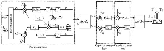 In Figure 1, the VSG grid-connected inverter system consists of three control loops, an outer loop: the power outer control loop; an inner loop: the capacitor voltage control loop, and the capacitor current control loop. It should be mentioned that a capacitor current is proposed in this paper, which can suppress the harmonics interaction. The specific analysis will be discussed in the following sections. The specific control diagram in Figure 1 is shown in Figure 2, where Pe, Qe, P0, and Q0 are the output active power, output reactive power, input active power, and input reactive power, respectively. Dp, Dq, J, ωn, ω0, and ω are the active droop coefficient, the reactive droop coefficient, the rotating inertia, the rated frequency, the grid frequency, and the output frequency, respectively.