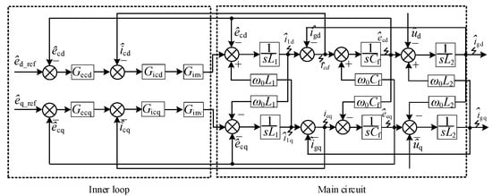 The reference capacitor voltage ed_ref and eq_ref are obtained by adjusting the power outer loop. Gecd, Gecq, Gicd, and Gicq are the PI regulators of the capacitor voltage control loop and the capacitor current control loop. Since the inner loop is much faster than the outer loop, regarding the harmonic interaction issue, the effect of the outer loop is negligible. Meanwhile, in DC to AC converters, the DC side and AC side are normally decoupled. Therefore, the small-signal model regarding the issue of harmonics interaction is not considered an effect of the DC-link voltage, since they are on different time scales [].