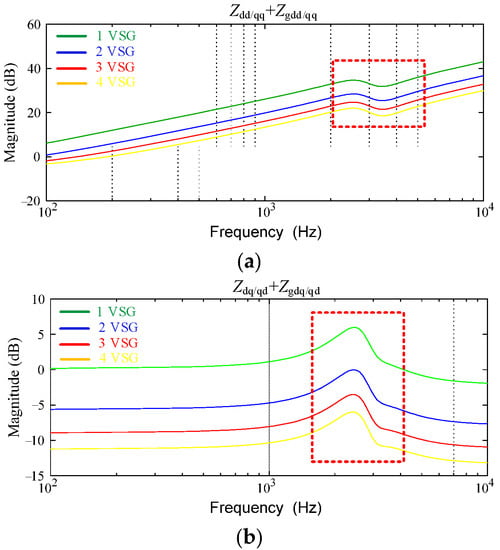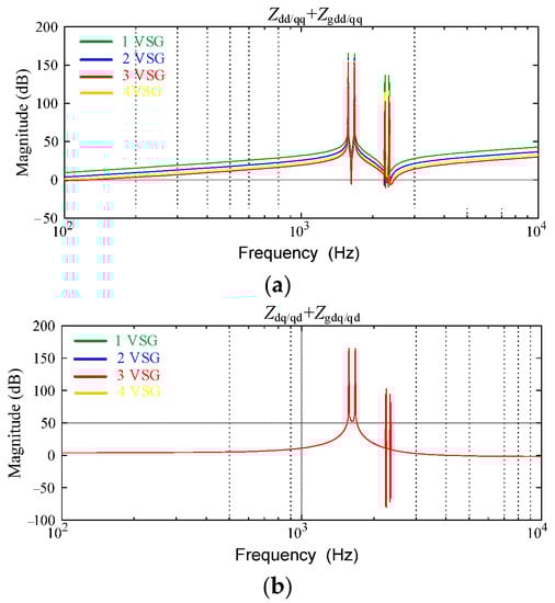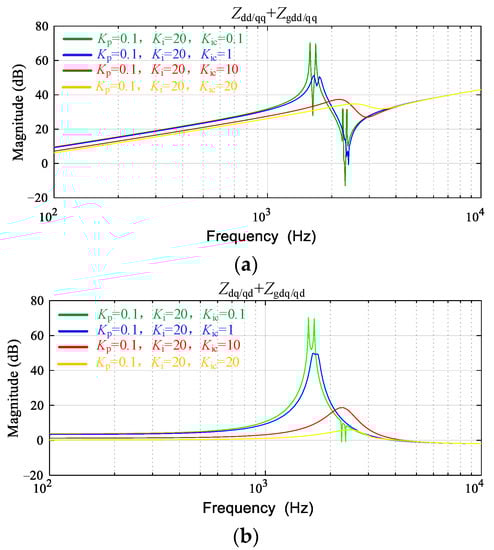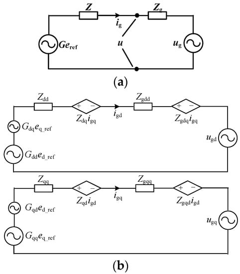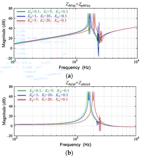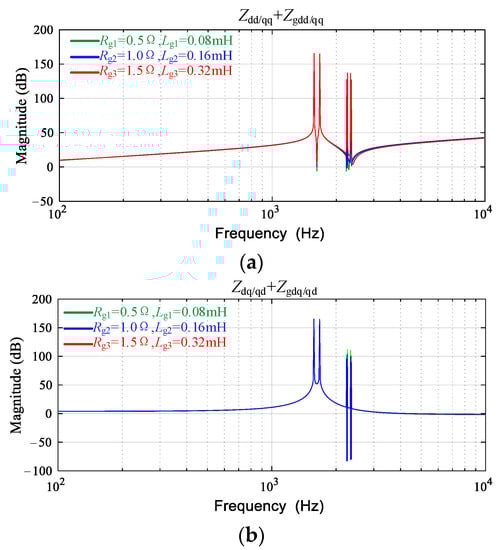 Zdd, Zqq, Zdq and Zqd are related to the controller parameters of the inner loop, and the control parameters in the d-q coordinate are generally the same. Therefore, Zdd = Zqq, Zdq = −Zqd, Zgdd = Zgqq, and Zgdq = −Zgqd. Therefore, Equation (12) can be simplified into Equation (13).