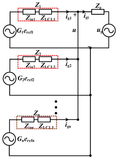 The above conventional methods to suppress the harmonic currents of a VSG are still unclear as to the mechanism. Therefore, the output impedance model of a VSG was established in order to explain the harmonic interaction in the mechanism. However, the inner-loop controller was not considered in the model, ignoring the influence of the inner-loop controller on the output impedance and resonant characteristics of the system. Furthermore, the output impedance model of an LCL-type grid-connected VSG was built in []; however, only a single VSG grid-connected inverter was investigated.