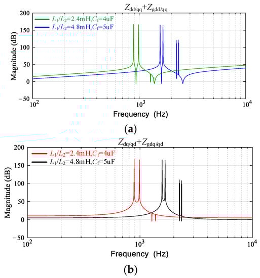 To analyze the influence of the different filter parameters on the resonant characteristics and the resonant frequency distribution of a grid-connected VSG, different LCL filter parameters were selected for analysis, and the Bode plots of the output impedance were obtained, as shown in Figure 7, demonstrating the low-impedance characteristic of the VSG. In addition, the sum of the output impedance without an inner regulator (i.e., without Zin1, Zin2, and Zinn) and the grid impedance has the resonance points. Therefore, when the LCL-type inverter based on a VSG is connected to the grid, there is a risk of harmonic resonance, and the resonance point is related to the filter parameters.
