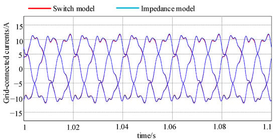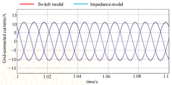 The correctness of the VSG impedance model and its cluster impedance model established in Section 3 were verified firstly. It can be seen from the time-domain simulation results in Figure 13 that the output currents of the impedance model and the switching model were identical in an ideal grid. In addition, according to the simulation results in Figure 14, the impedance model and the switching model were also identical in a distorted grid, indicating the effectiveness of the VSG impedance model.
