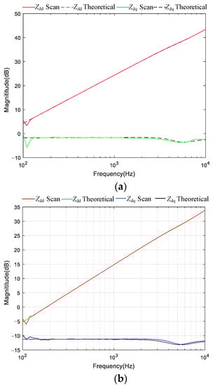Meanwhile, the impedance scanning method was used to compare the actual values with the theoretical calculation values, and the comparison results were obtained, as shown in Figure 15. The results showed that the output impedance of the theoretical calculation was identical to the scanned impedance, indicating the effectiveness of the impedance model of the VSG established in this paper.